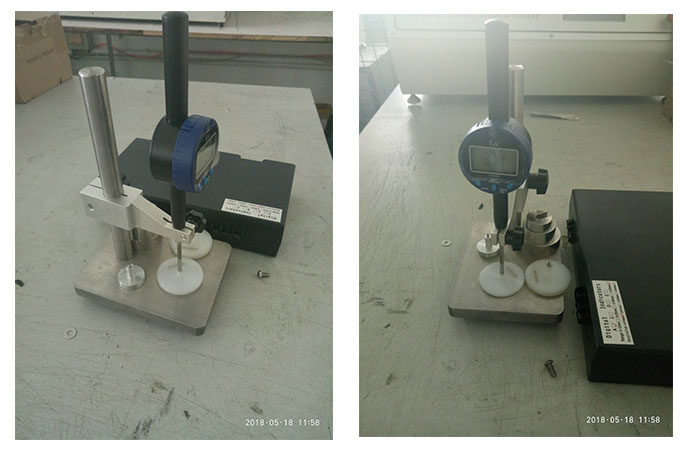將試樣放置在基準(zhǔn)版上,用壓腳對試樣施加壓力,測量接觸試樣的壓腳面積與基準(zhǔn)板之間的距離,即為厚度值。