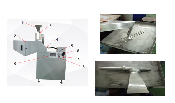 角度可調(diào)碰撞室、3D碰撞室、噴槍、氣動(dòng)震動(dòng)進(jìn)料口、收集箱、電控柜、PLC顯示屏